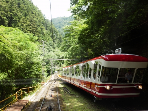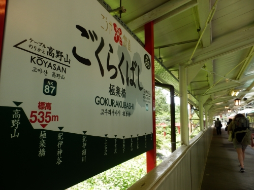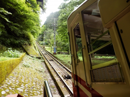 橋本駅から先は一つ一つが小さな駅で、さっきまで大阪にいたことが信じられないくらい緑が深まっていきます。電車は標高差443mという傾斜をだんだんと登りはじめ、深い山の緑に圧倒されていると、終点の極楽橋駅。ここで、ケーブルカーに乗り換えです。