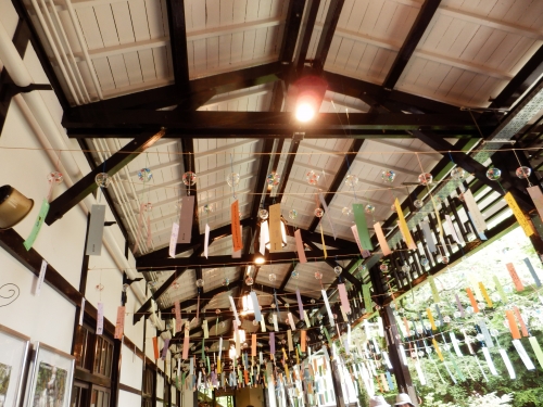 極楽寺駅から発車するケーブルカーは、南海電車が到着するのに合わせて出発するので急がなくても大丈夫。夏場には、乗り換え用の通路を歩いていると、上から涼しげな音が聞こえてきます。見上げるとたくさんの風鈴。短冊には願いごともかかれています。