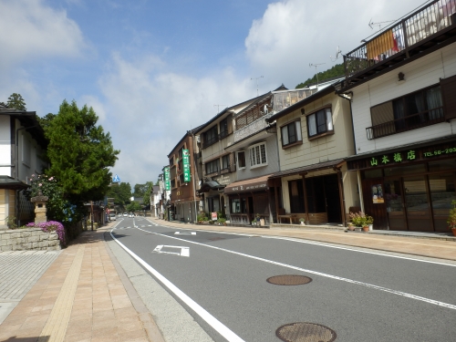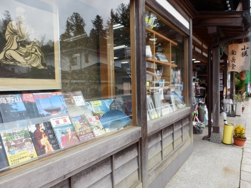 高野山は東西に6km、南北には3kmの広さしかないため、歩いてでも移動できます。千手院橋で下車し、西に歩いていくと、本屋らしきお店や木造の出版社…歩きながら周りを見渡すと、古い佇まいのお店が多く、タイムスリップしたような気分に。