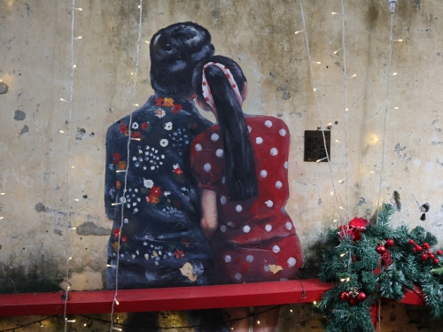 チャイナタウンの路地裏に壁画アートで話題のスポットがあります。「鬼仔巷」と書かれた門があり、一見その奥には何があるのかわからない不思議な感じですが、門をくぐり赤い橋を渡ると、なんと1960年代の中華街の日常風景が広がっているんです。まるでタイムスリップしたかのようなノスタルジックな雰囲気!