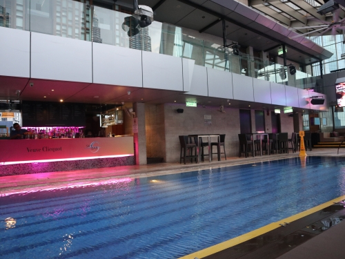 昼間はホテルのプールとして利用されていますが、夜になるとプールサイドがバーになり、ガラス窓側には掘りごたつのようなソファー席があり、ゆったりくつろぎながらツインタワーを眺められます。また、20時、21時、22時にタワー前で行われる噴水ショーも見えるので、お見逃しなく!