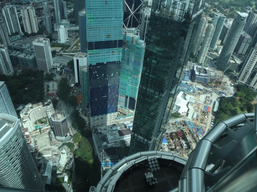 まず見学するのは、41階のスカイブリッジ。15分間と見学に時間制限がありますが、空中散歩しながらタワー1とタワー2を行ったり来たりしつつ、思い思いの写真撮影をするには十分な時間です。橋なので大勢の人が歩くとやや揺れを感じて怖いですが、近未来都市のKLCCが間近に眺められます。