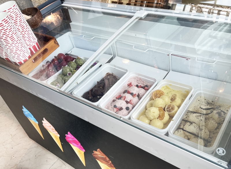 マップにはありませんでしたが、デザートのアイスクリームは、少し遅めの時間から6種類提供されていました。濃厚で滑らかな、それでいて後味スッキリのアイスクリームは、お腹いっぱいでも食べれます。