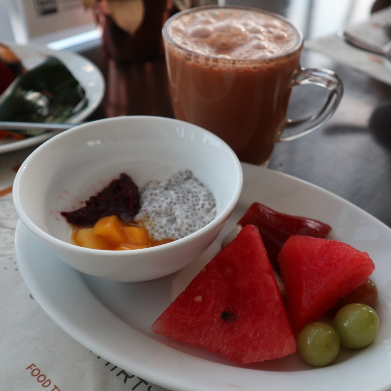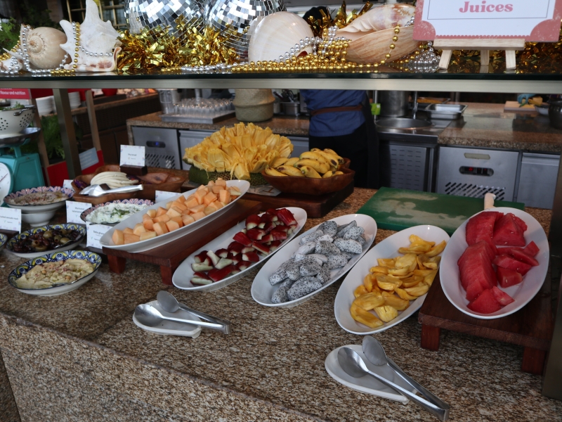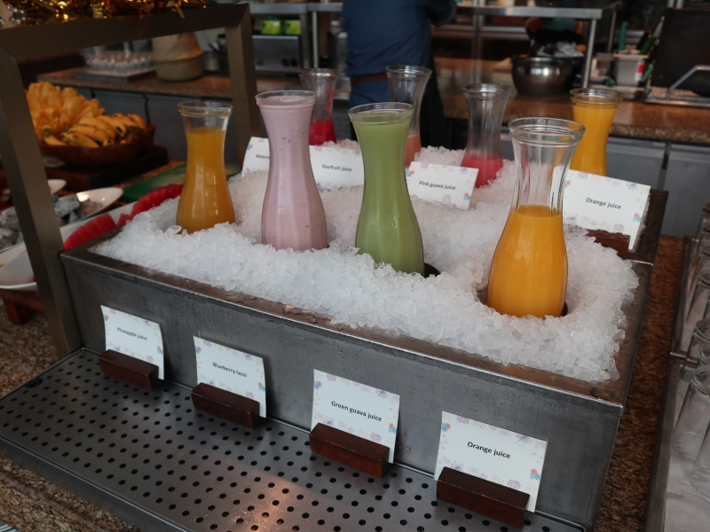 「ブルーベリーラッシー」や、「グリーンガバジュース」など、カラフルなフルーツジュースはどれを飲んでも◎。フルーツコーナーには、スイカ、ジャックフルーツ、ドラゴンフルーツ、洋ナシのような食感のマレーアップルが並んでいます。
