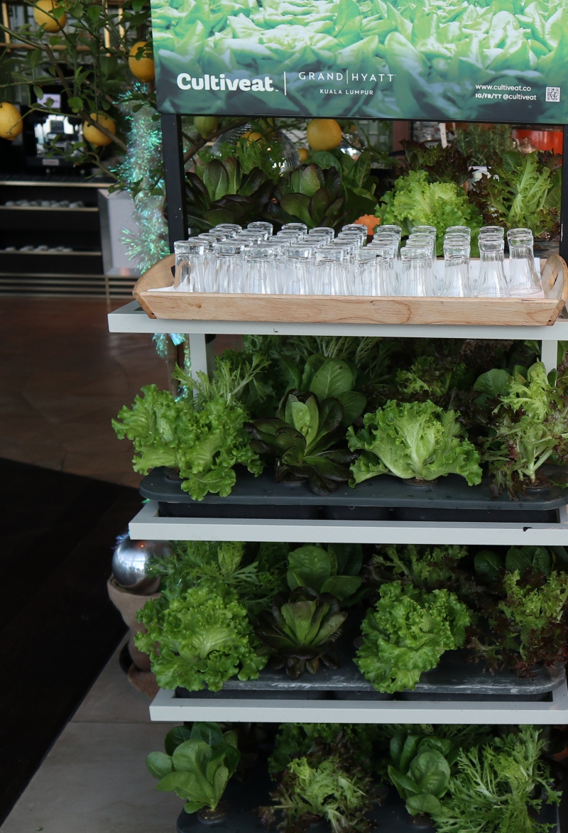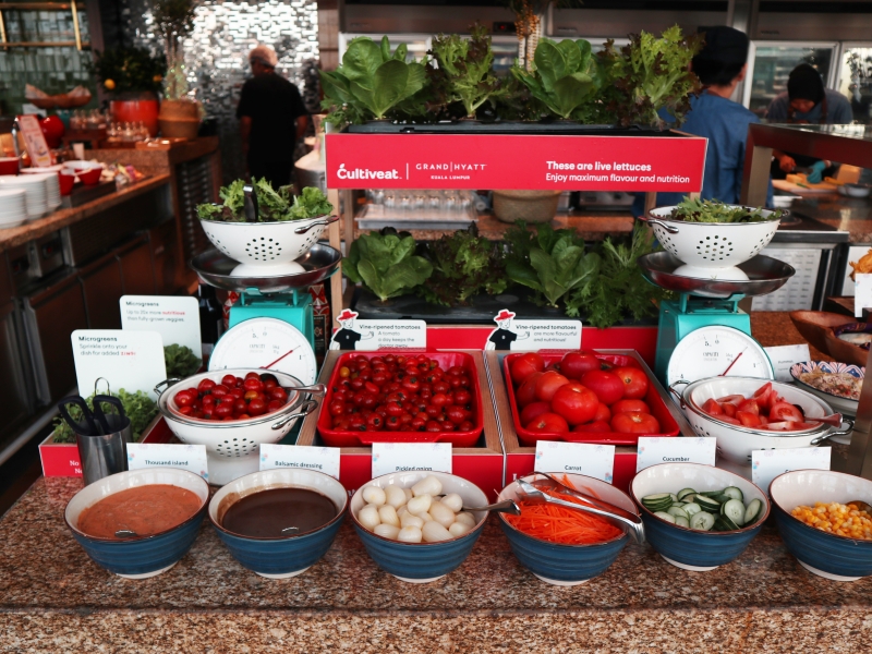 葉物はハサミを使って自分で刈り取るマレーシアスタイルのサラダコーナー。大小様々な完熟トマトも美味しそうです。