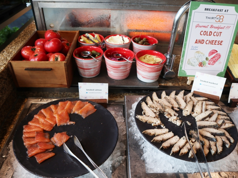 前菜やパンに挟んでサンドイッチにもできる、「スモークサーモン」「燻製サバ」「サラミ」「チーズ」など色々。分厚いスモークサーモンが人気でした。