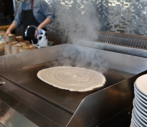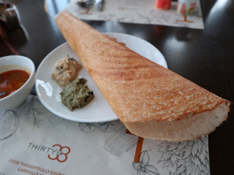 筆者は筒状の「トセイ(Tosai) 」と呼ばれるカリカリの薄いクレープをオーダーし、カレーやミントペーストなどをつけていただきました。トセイは外側はカリッと内側はふわっとしたW食感で、酸味も少し感じる不思議なクレープですが、カレーによく合います!