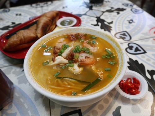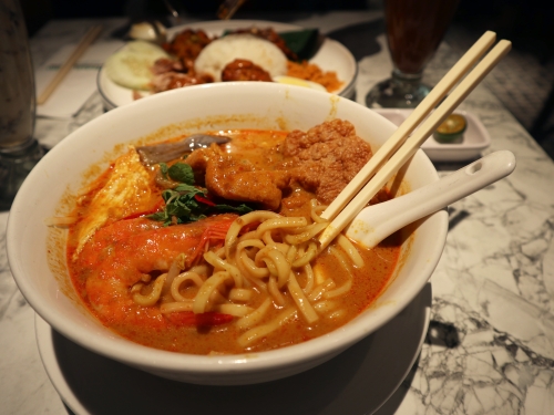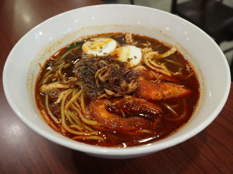 ペナン名物料理の「プロウンミー(蝦麺)」は、海老出汁がきいたクリーミーで濃いスープが特徴。見た目は真っ赤ですが、そこまで辛くなく、海老の旨味がギュッと詰まったスープは飲み干してしまうほどの美味しさ。
