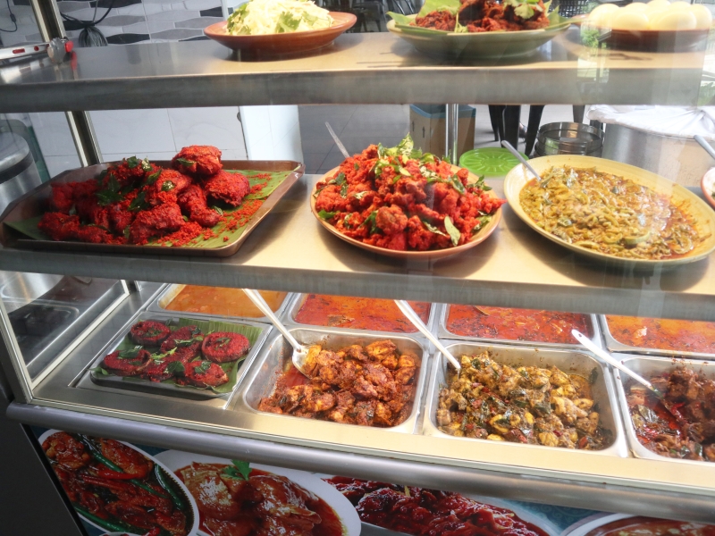 おしゃれなショッピングエリア「The Row(ザ・ロウ)」のすぐ近くにある、インド系マレーシア料理を提供するレストラン。店頭には、美味しそうなチキンやカレーが並んでいます。