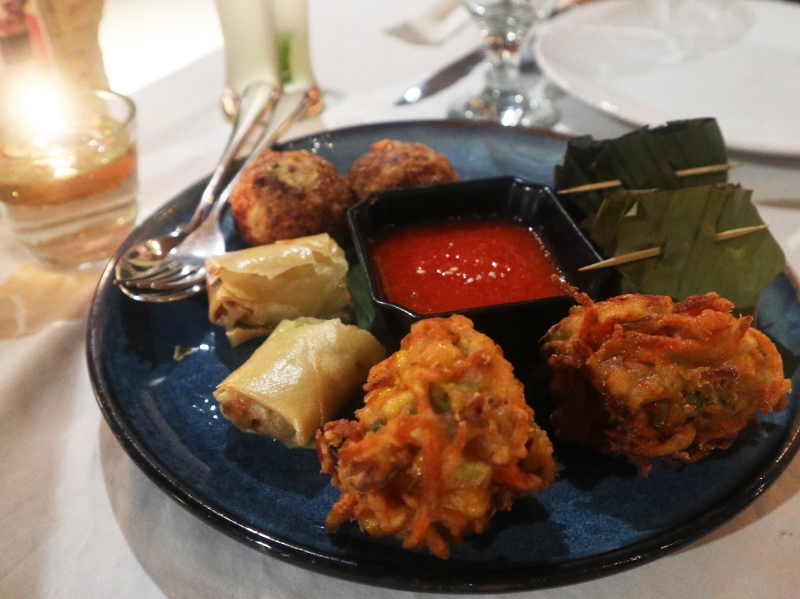 マレーシア風海老と野菜のかき揚げやマレーシア風コロッケ、春巻きが盛り付けられた前菜は食べ応え抜群!伝統的な料理を一皿で堪能でき、味がしっかりしているのでお酒にも良く合います。