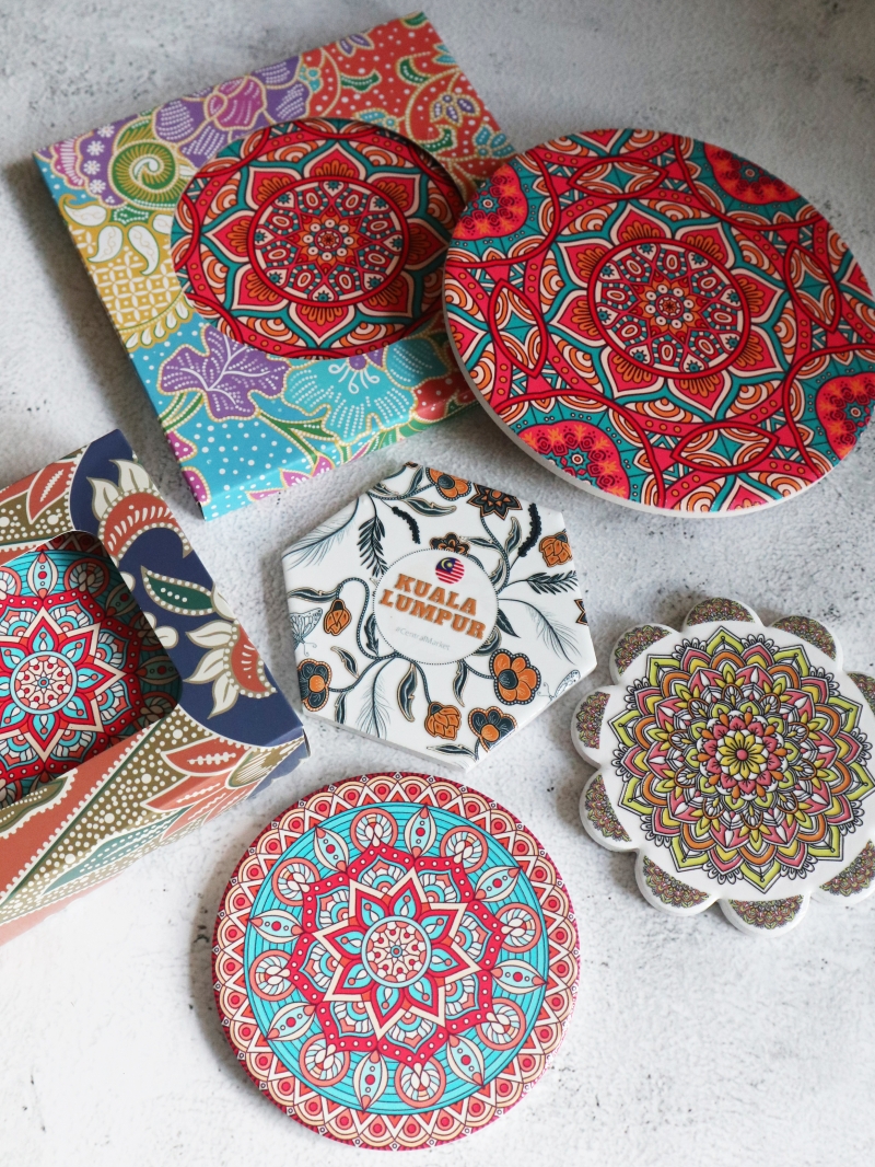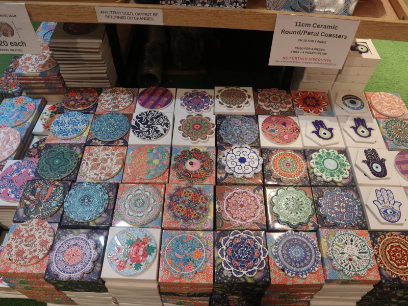 マグカップ、コンパクトミラー、冷蔵庫用マグネット、コースター、トリベット(鍋敷き)など、マレーシアの植物や文化を感じる美しい柄の陶器製品がお手頃価格で手に入ります。