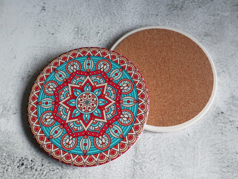 コースターやトリベットは、よく見ると絵柄がエンボスになっているので、光にあたるとキラっと輝き、置くだけでテーブルの上が華やかに。裏面にはコルクシートが貼られ、丁寧なつくりなので、テーブルを傷つけることもありません。