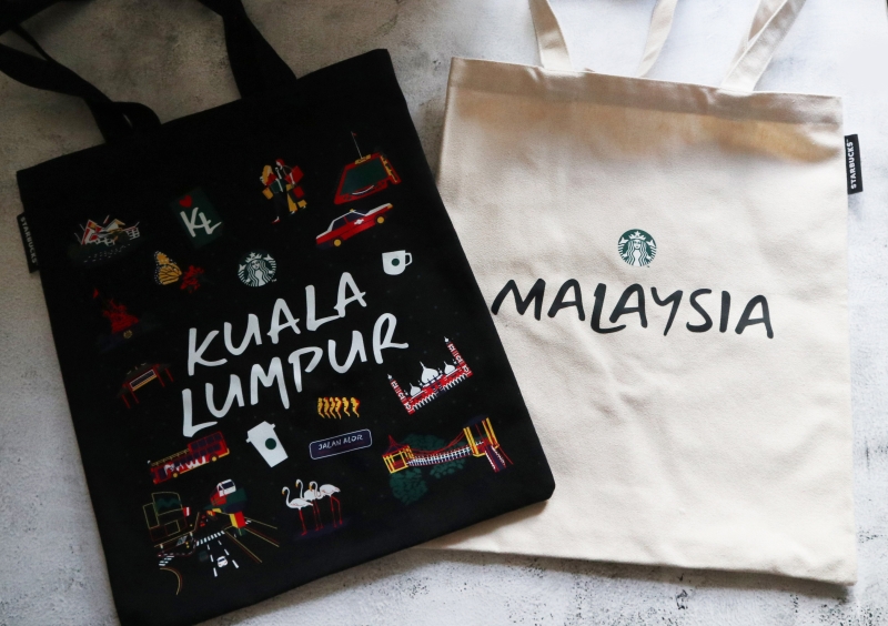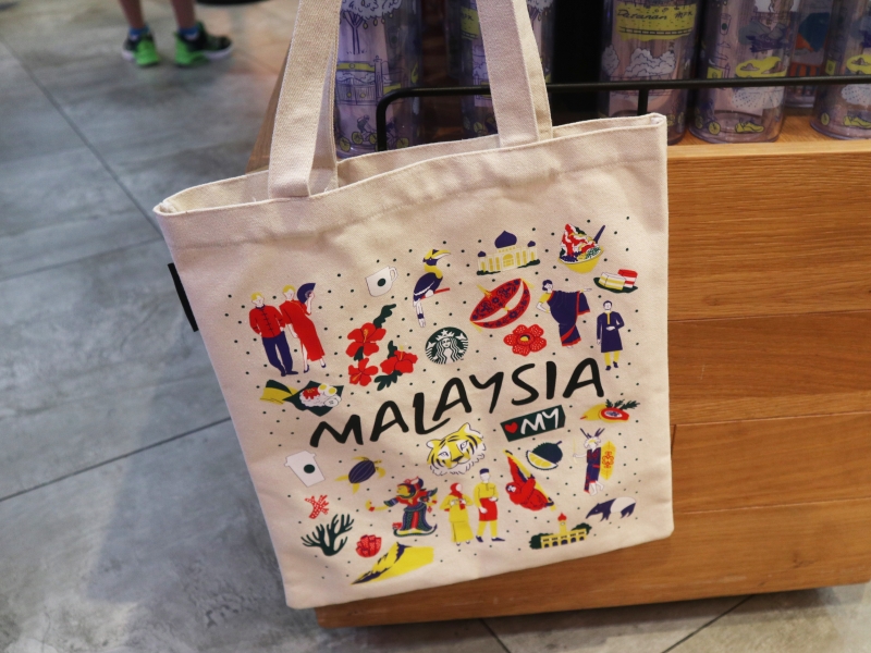 スターバックスのご当地グッズは、旅先のお土産に欠かせません。クアラルンプール国際空港ターミナル1のサテライトビルにあるスターバックスで発見したのが、マレーシアとクアラルンプールのイラストがキュートなトートバッグ。2枚セットで販売されています。