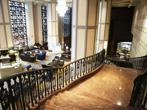 クアラルンプール市内中心部にある「シェラトン インペリアル クアラルンプール ホテル」は、シックなデザインの外観で、メインエントランスから館内に入ると、映画『タイタニック』を思わせる螺旋状の階段があり、3階までが吹き抜けで落ち着いた空間が広がる高級ホテルです。