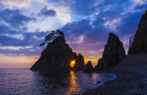岩手県の久慈市にある小袖海岸。平成25年(2013年)に放送されたNHKの大人気朝ドラ『あまちゃん』の舞台にもなった場所です。『あまちゃん』のモデルとなった“北限の海女”がいる「小袖漁港」や、三陸らしいド迫力の海岸線の造形美に、穴の開いた岩山が非常に特徴的な景勝地「つりがね洞」などの見所があります。