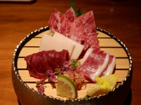 写真:旅田サトシ 馬肉ダイニング馬桜 下通り店 |  写真:旅田サトシ 特上馬刺し盛り(4種、1人前・税込2,700円~) |  写真:旅田サトシ 桜ヒモ 串焼き(2本・税込980円) |