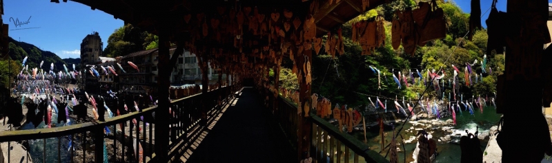 たくさんの鯉のぼりが気持ちよさそうに泳いでいます。また、くまモン型の絵馬に願いを書き込んで祀ることができる紅葉橋も見逃せません。