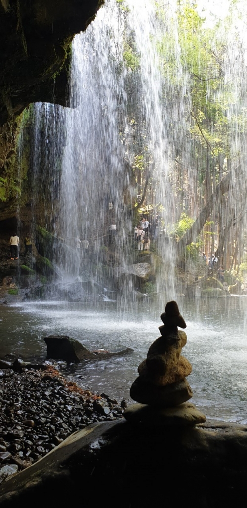 後ろから滝を見ることができることで人気のこちらの滝は、メディア露出が増えてから、駐車場も増設され、多くの観光客で連日にぎわっています。遊歩道を下ると見えてくるのは、森林に囲まれたオアシス。滝の裏にまわると、より一層マイナスイオンを感じることができます。