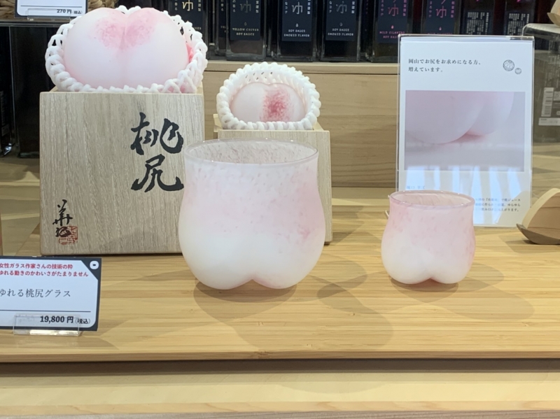 「ゆれる桃尻グラス(19,800円:税込)」も、有隣庵の「桃ジュース」を入れるグラスとして使用されています。岡山らしい桃の形が独特で魅力的です。