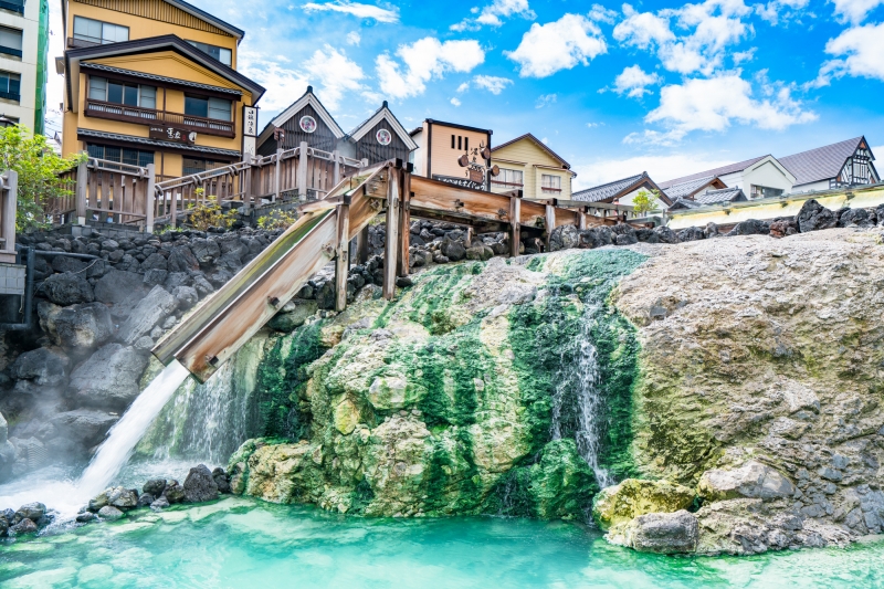 「大滝乃湯」は煮川源泉を引いており、観光客が煮川源泉に入れるのはここだけ。内湯と露天風呂のほかに、草津温泉ではここにしかない”合わせ湯”があります。合わせ湯とは一番温度の低い38℃~40℃の浴槽から、一番温度の高い浴槽は45℃~46℃までの異なる温度の浴槽を順番に入るもの。特産のくま笹を練りこんだ”くま笹ざるうどん”などがいただける食事処もあり、温泉とお食事をゆっくり楽しんでみては。