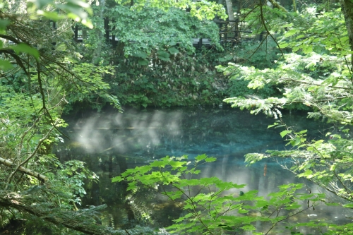 裏摩周展望台から車で約15分移動すると、「神の子池」へ到着です。神の子池とは、摩周湖の伏流水でできていると言い伝えのある神秘的な池です。水深は5メートル。エメラルドブルーに輝く姿と、水中に沈んだ化石のような倒木に圧倒されます。
