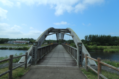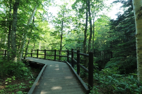 引き続き道の駅摩周温泉に車を停車したまま、15分程周辺をお散歩します。近くには釧路川が流れており、橋の上から素敵な景色を眺めることができます。橋には西アフリカ産の高耐久性木材が使用されているそうで、「なんだろう橋」と名付けられています。木の橋とは珍しいですね。