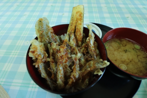 わかさぎ天丼は、わかさぎとナスの天ぷらがたっぷりのったメニューです。写真だけでは伝わりにくいですが、とにかく阿寒湖産わかさぎの美味しさが際立ち、衣のカリカリ食感と、わかさぎのジューシー感を堪能できます。