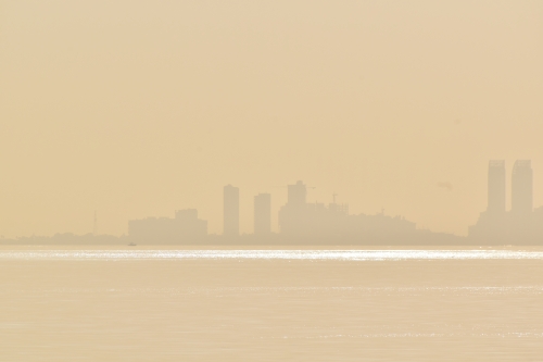 美しい海の眺めと、その先に見える高層ビルの図が幻想的です。
