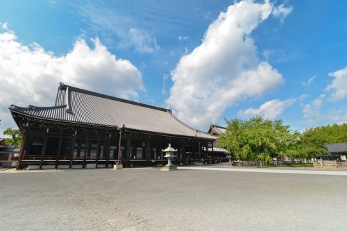 東本願寺は真宗大谷派の本山で、正式名は真宗本廟です。本願寺は1272年(文永9)宗祖親鸞の娘の覚信尼が東山大谷の地に仏堂を建て親鸞の御影を安置したのが始まり。室町時代、蓮如の時代に教団が飛躍的に発展し、戦国時代には大きな勢力となって織田信長にも対抗しました。その後、徳川家康がこの地を寄進し、教如が堂舎を建てたのが本堂の始まりです。たびたび火災に遭い、現在の建物はいずれも明治時代に再建されたものですが、真宗寺院の典型的な様式と配置を示しています。京都タワーとのコントラストは一見の価値がありますよ。
