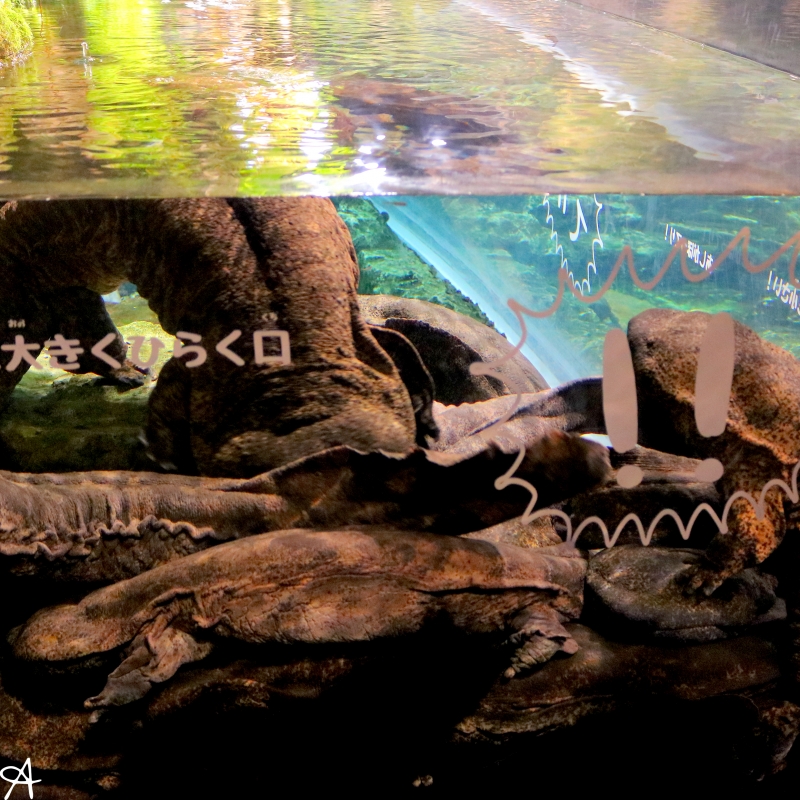 入館して最初に出迎えてくれるのが、国の特別天然記念物・約10匹のオオサンショウウオです。水槽に白い字でわかりやすく特徴が書いてあり、謎に包まれた生態を知ることができます。