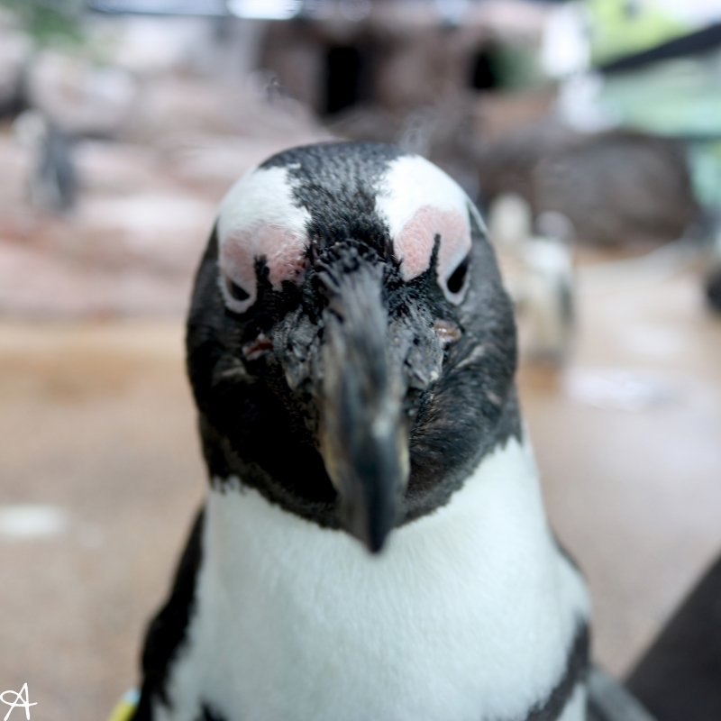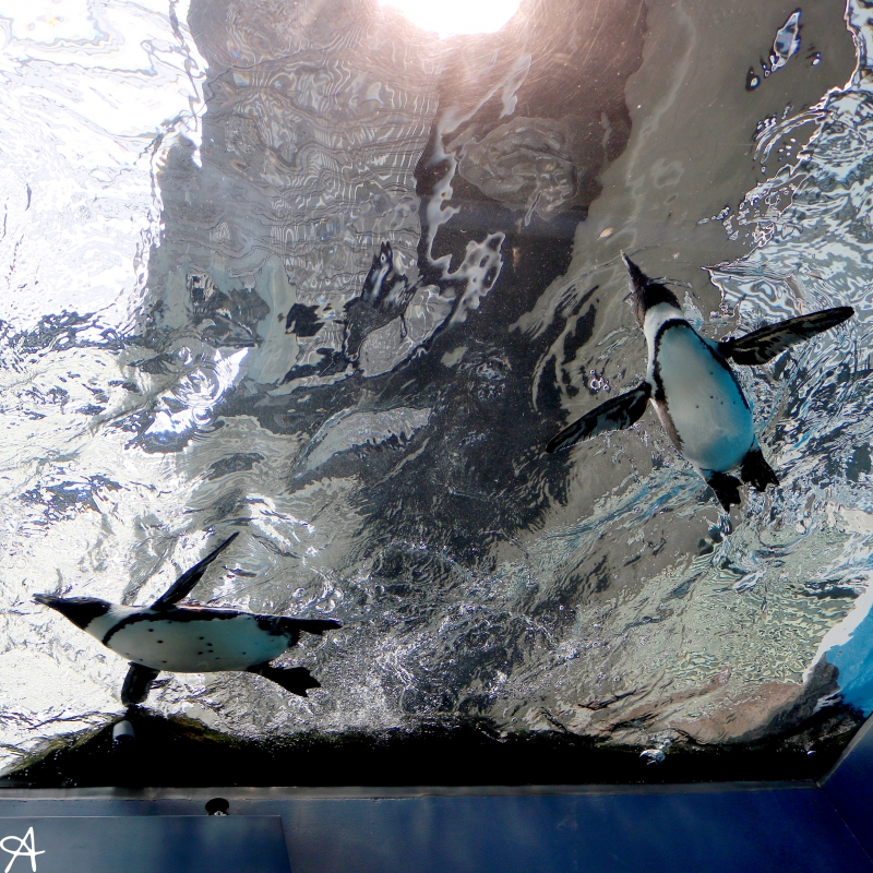 順路通りに歩いていると、まずは水槽の下から、自分の頭上を泳ぐペンギンを見ることができます。続いて水槽を横から見ることができます。ここには目や嘴の周りがピンク色のペンギンがおり、とってもキュートです。