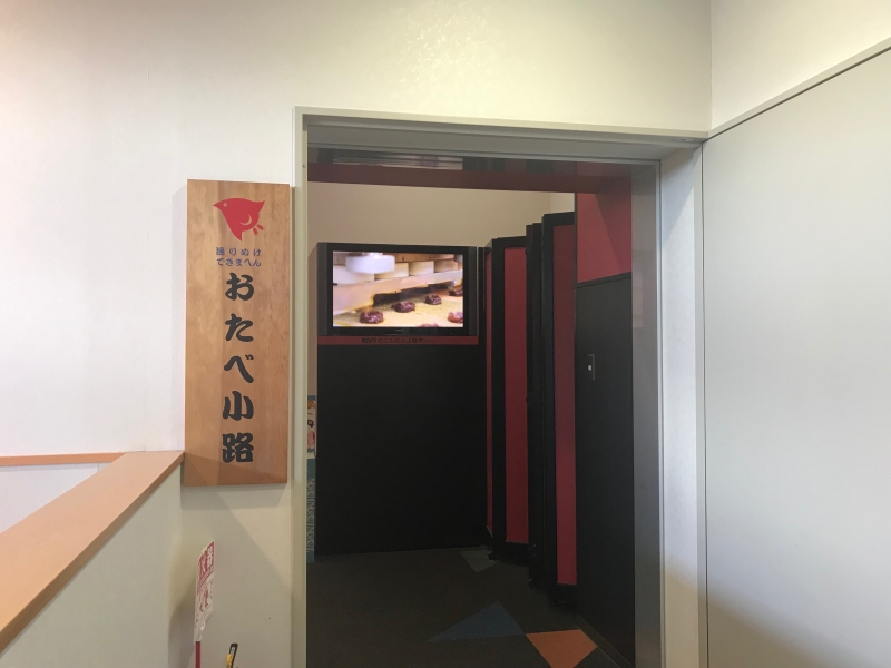 京都十条にあるおたべの工場では、主に生八つ橋の製造を行っています。本館店舗の2階にあり、「おたべ小路」「おたべ体験道場」という2つのセクションに分かれています。