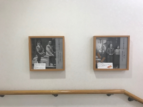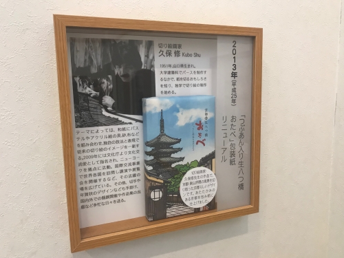 2階から1階へと続く階段には、おたべの歩んできた歴史が、ギャラリー形式で展示されています。後発の八つ橋ブランドであったおたべの歩みを振り返ることができます。