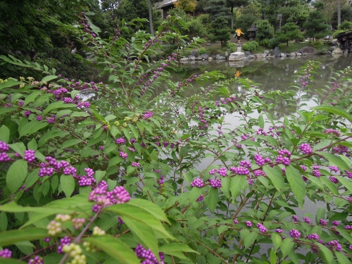 秋には、ススキやハギ、キキョウなどが鑑賞できます。また、ムラサキシキブの実も淡い紫に色付きます。