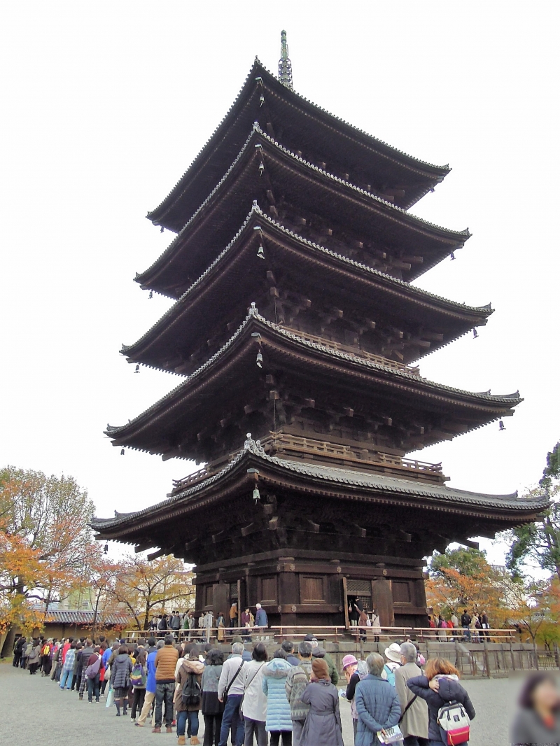 秋の紅葉の時期に、東寺を訪れてみました。いつも電車の車窓から眺めていた五重塔を、やっと目の前で見ることができ、とてもうれしく感じました。庭園の紅葉や境内の建築物も素晴らしかったです。京都駅からも近いので、みなさんも訪れてみてはいかがでしょうか。(ゆきたか)