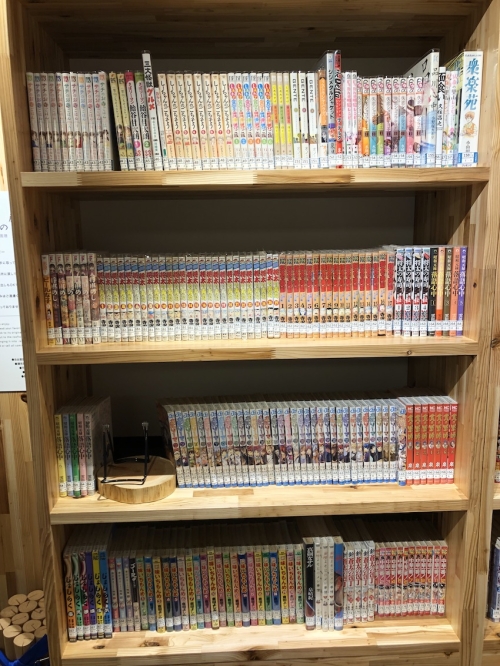 まんがの壁は「日本で人気のグルメ漫画・料理漫画の総まとめ」といえる品揃え。食の漫画のみ展示する施設として京都唯一と言えるでしょう。