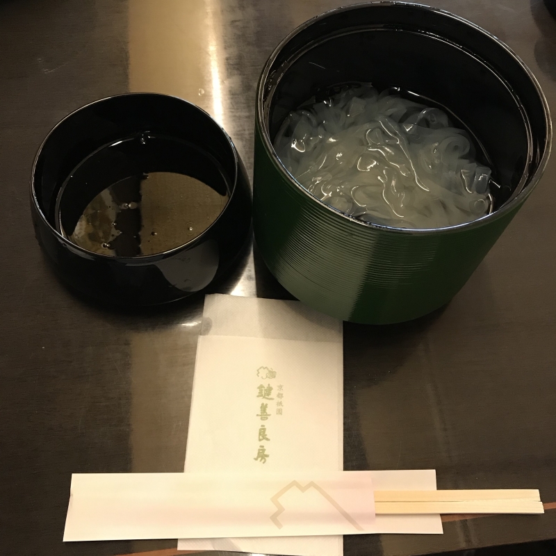 鍵善良房の名物といえば「くずきり」。吉野本葛粉と水で作ったツルツルのくずきりに、沖縄の波照間産の黒糖を使った黒蜜をかけていただきます。くずきり以外に、わらびもちやグリンティーなどの和スイーツやドリンクも。