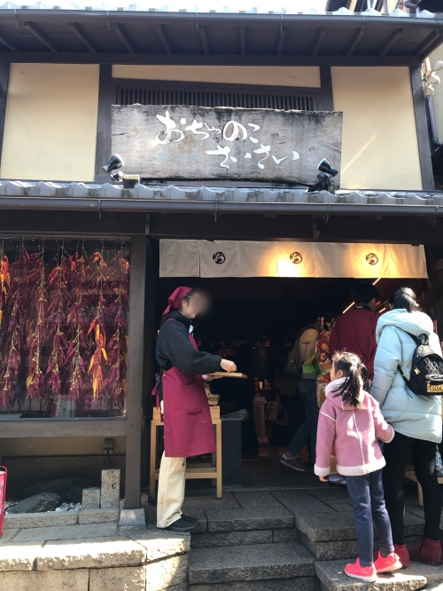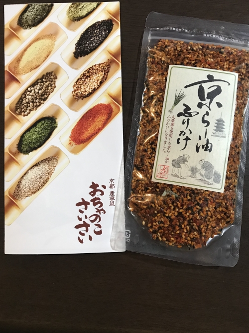 明保野亭の隣には、七味唐辛子で有名なおちゃのこさいさいがあります。入り口に沢山の唐がらしが干してあるのが目印。舞妓さんの絵柄の容器に入った七味や一味(¥650)はお土産に人気。京らー油ふりかけ(¥550)は、ほんのりした辛味と旨味が絶妙なふりかけ。自分用に購入するのも良いでしょう。