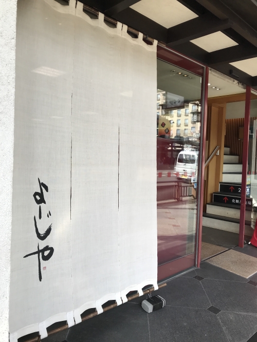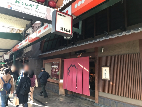 四条通りを歩く際には、享保年間創業の鍵善良房(かぎぜんよしふさ)でくずきり(¥1,080)を頂きながら休憩するのもおすすめです。看板は上にあるので見つけ辛いですが、大きな暖簾が目印です。店内は、手前がお土産用の甘味を販売するスペースとなっており、奥へ進むとcafeになっています。