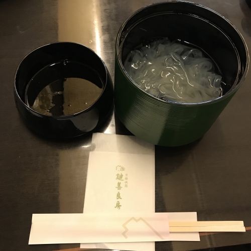 カフェスペースは広く、居心地の良い空間になっているので、ゆっくりと京の甘味を頂けるお店となっています。くずきり以外に、わらびもち(¥900)やグリンティー(¥500)などもあります。