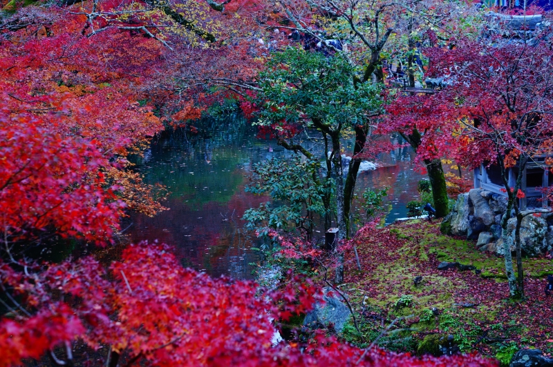 南禅寺のすぐ隣にあり一緒に行っていただきたいのが、この永観堂です。紅葉が永観堂全体を包み込んでくれるような美しさで、真っ赤に染まった光景を目にすることができます。赤い紅葉に囲まれたお庭に、建物の間から見える紅葉、紅葉が散らばった階段と、紅葉づくしの光景です。