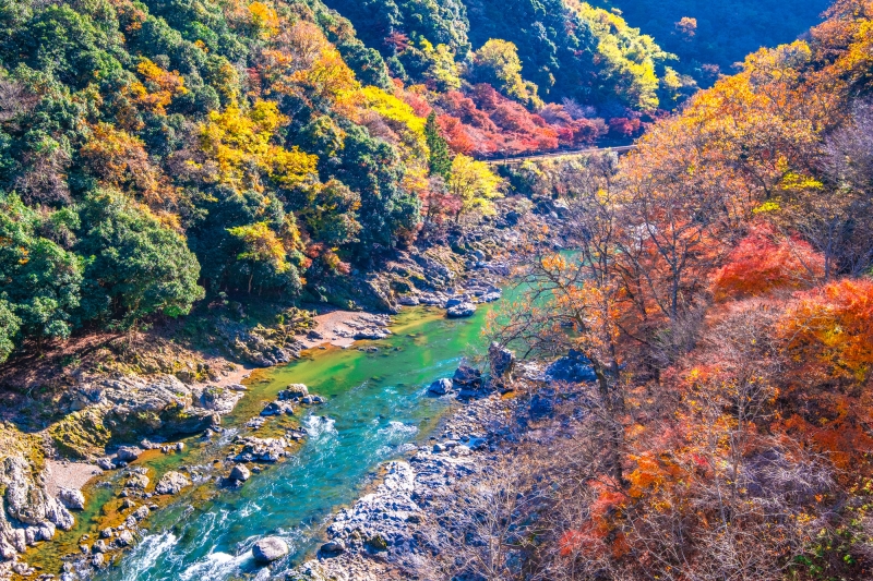 保津峡では、船で下る「保津川下り」という人気のアトラクションがあり、船頭が巧みに操る船に乗り、約16kmの蛇行した渓流を約2時間かけて下ることができます。秋には川面から、保津峡の紅葉や渓谷美を堪能できますよ。