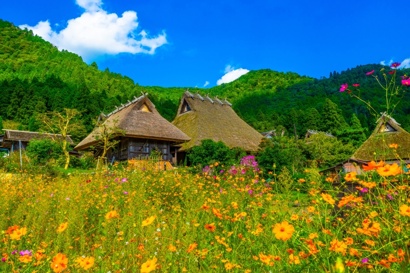 かやぶき屋根が並ぶ景観も見事ですが、コスモスの名所としても知られており、秋の観光にもおすすめ。例年9月中旬頃〜10月中旬頃には、コスモスやキバナコスモスと茅葺き民家とのコラボレーションが楽しめます。