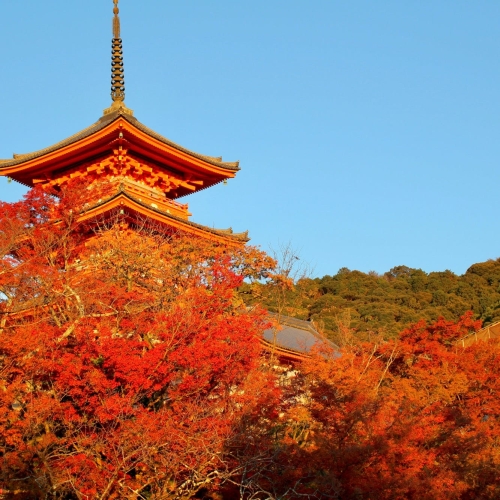 「清水の舞台」で知られる、京都で最も観光客が多く訪れる寺院の一つ。紅葉の名所としても名高く、秋には舞台が真っ赤な紅葉で包まれます。三重塔周辺のもみじの色づきも見事で、秋ならではの絶景に出会えます。