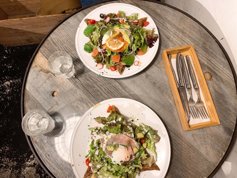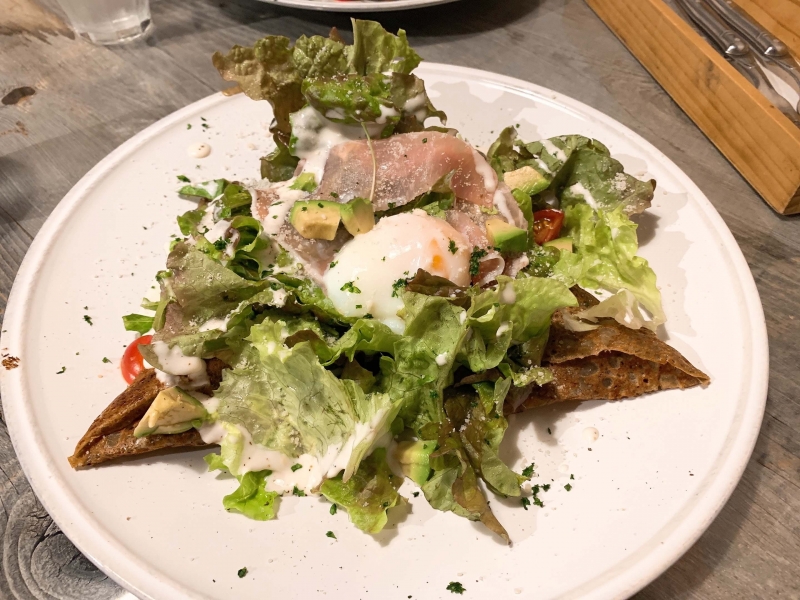 大きな平皿にこんもりと盛り付けられたサラダとガレットはボリュームもたっぷり。生地はもちもちと柔らかいのに重たくなく、女性でもペロリと一枚食べ切れてしまいます。