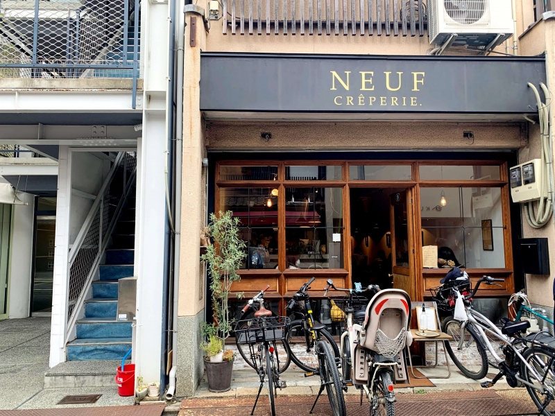 地元の方からも人気の高いCreperie NEUFは、丸太町駅7番出口から南へ下り、夷川通りを東へ徒歩5分ほどのところにあります。お店の前には自転車がずらり。地元の方からも愛されているのがわかります。