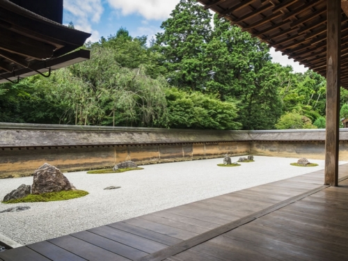【20】龍安寺:美しい石庭で知られるお寺。三方を囲まれた幅25m、奥行き10mあまりの長方形の白砂に、15個の石を配した石庭は、世界でも高く評価されています。<龍安寺のスポット情報