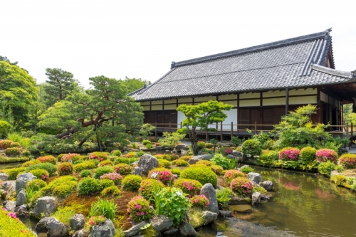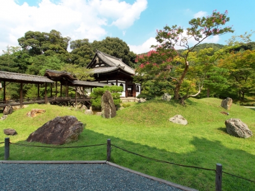 【8】等持院:足利家の菩提寺で、足利尊氏の墓所があることで知られています。衣笠山を借景にした池泉回遊式は、天龍寺や西芳寺の庭などを作庭した夢窓国師が構築。<等持院のスポット情報
