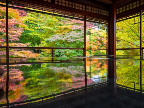 【10】瑠璃光院:黒いテーブルに紅葉が反射する光景が美しすぎると、SNSで話題となり今や大人気。通常は非公開ですが、春と秋に二ヶ月間ほど特別公開されます。<瑠璃光院のスポット情報