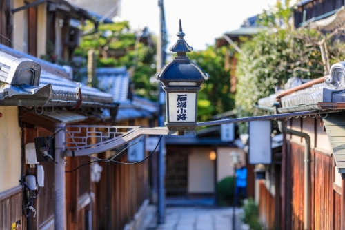 【11】石塀小路:高台寺通り(ねねの道)へ通り抜けることができる小道。石畳に沿って町屋が連なる街並みが、なんとも京都らしい情緒を漂わせています。<石塀小路のスポット情報